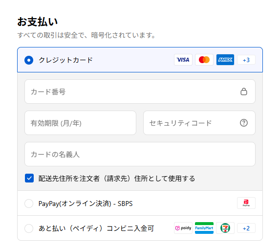 ※請求先住所とクレジットカードにご登録の住所が異なると、セキュリティの都合上、注文が自動キャンセルとなる場合がございます。