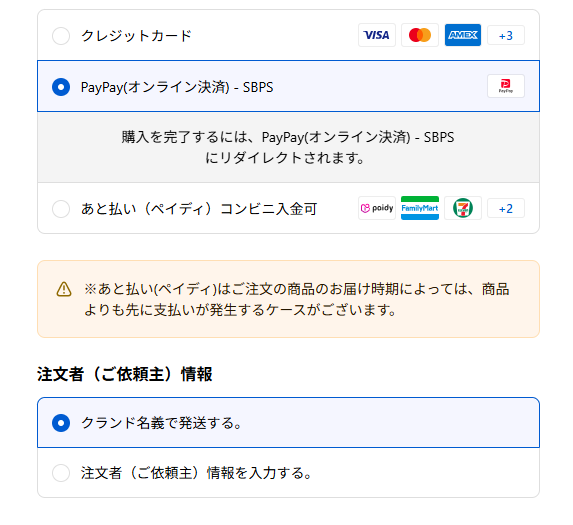 注文者情報にて「クランド名義で発送する。」をご選択ください。